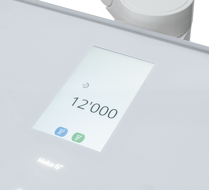 On the Heka G+ we have situated all the instru- ment information centrally on the delivery tray so that both you and your assistant can easily get an overview of the settings. The screen display can be operated by touch and we have made sure that the necessary functions can be changed via the foot control to minimise touching the delivery tray.