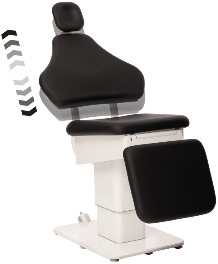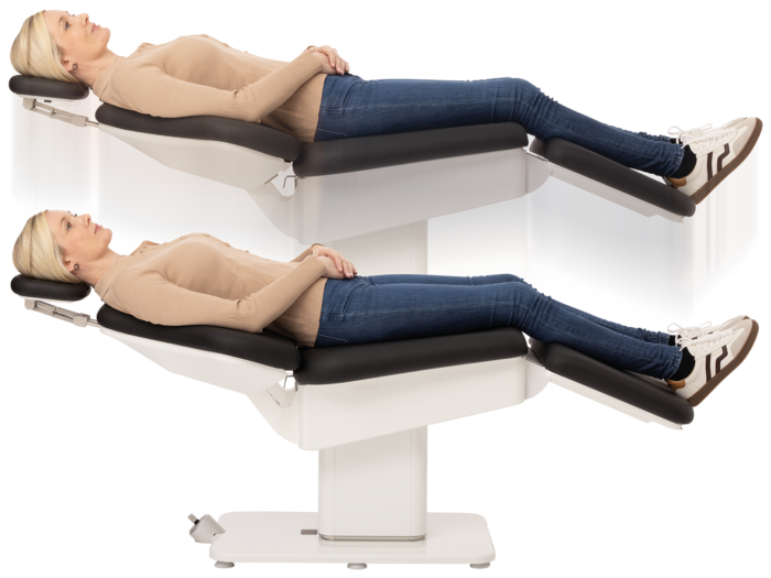 When transitioning the patient from a seated to a supine position, the chair moves in a smooth, almost floating motion designed to support the body’s natural anatomy, particularly the relationship between the back and neck.