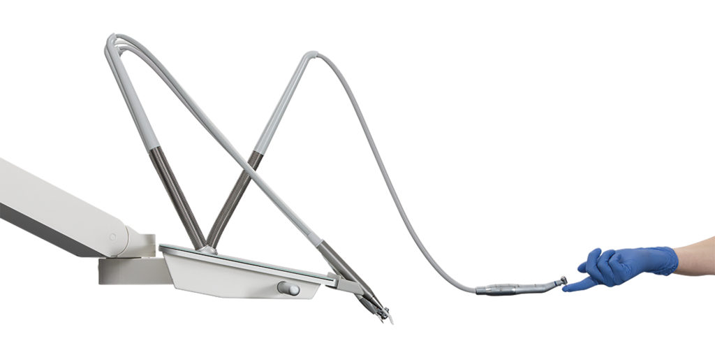 The assistant unit is placed on a flexible telescopic arm, which ensures the best position with both 2- and 4-handed treatments. At the same time, switching between right-left dental treatment takes just a few seconds without the use of tools by placing the telescopic arm on the patient’s chair. This gives you great flexibility in choosing a treatment room during a busy working day.